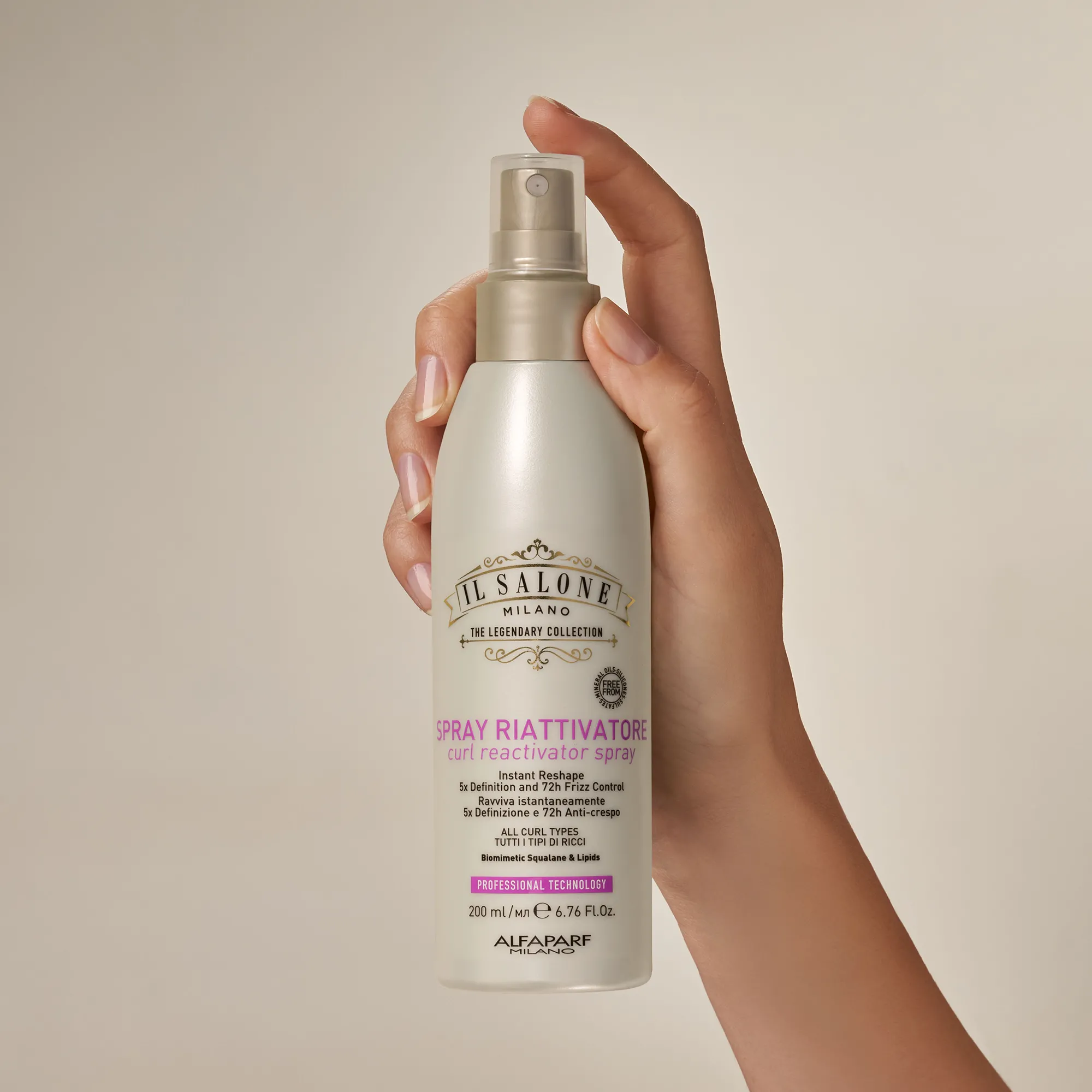 Il Curl Reactivator Spray di ALFAPARF MILANO Il Salone è uno spray leave-in professionale che ravviva e ridefinisce istantaneamente la forma dei ricci tra un lavaggio e l’altro. Dona ricci 5 volte più definiti* e garantisce fino a 72 ore di controllo anti-crespo, lasciando i capelli elastici, luminosi e disciplinati. Usato dai parrucchieri, è ideale per mantenere i ricci sempre perfetti e senza appesantirli.