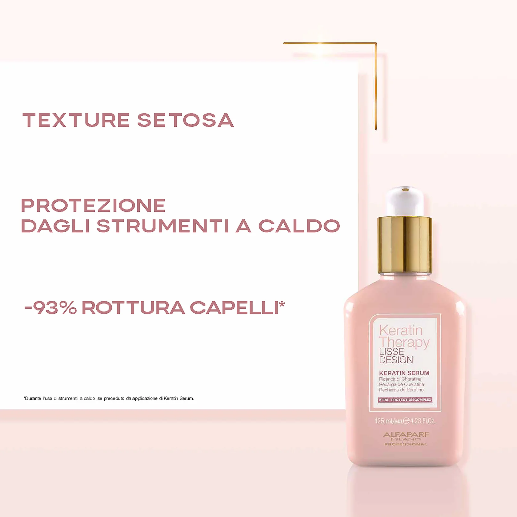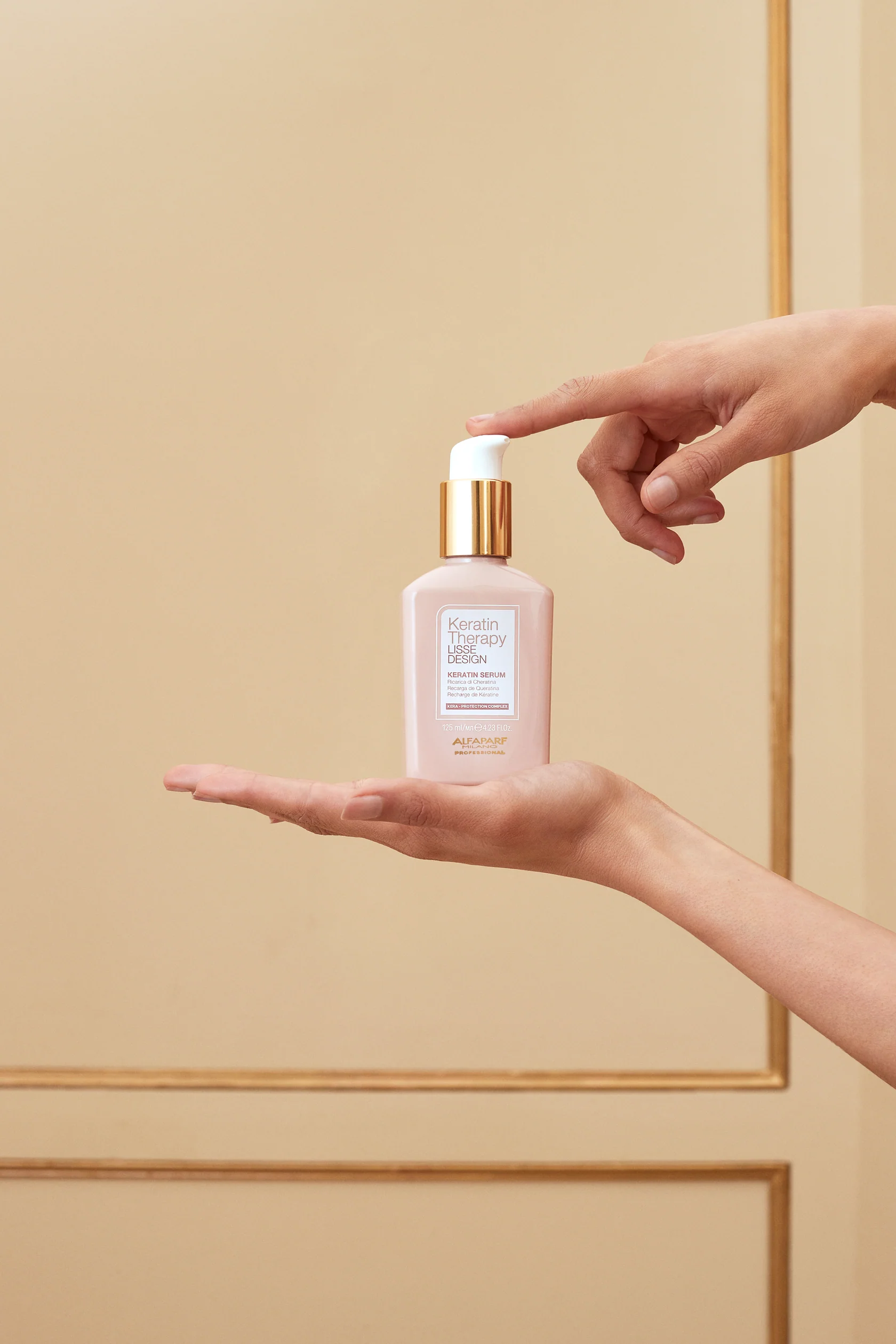 Il Keratin Serum della linea Keratin Therapy Lisse Design di ALFAPARF MILANO è un siero ricarica di Cheratina e Collagene, studiato per mantenere e prolungare i risultati dei trattamenti professionali di lisciatura alla cheratina.