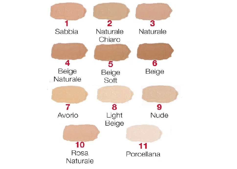| COLORE | 1 SABBIA, 10 ROSA NATURALE, 11 PORCELLANA, 2 NATURALE CHIARO, 3 NATURALE, 4 BEIGE NATURALE, 5 BEIGE SOFT, 6 BEIGE, 7 AVORIO, 8 LIGHT BEIGE, 9 NUDE |