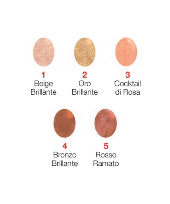 | COLORE | 1 BEIGE BRILLANTE, 2 ORO BRILLANTE, 3 COCKTAIL DI ARANCIO, 4 BRONZO BRILLANTE, 5 ROSSO RAMATO |