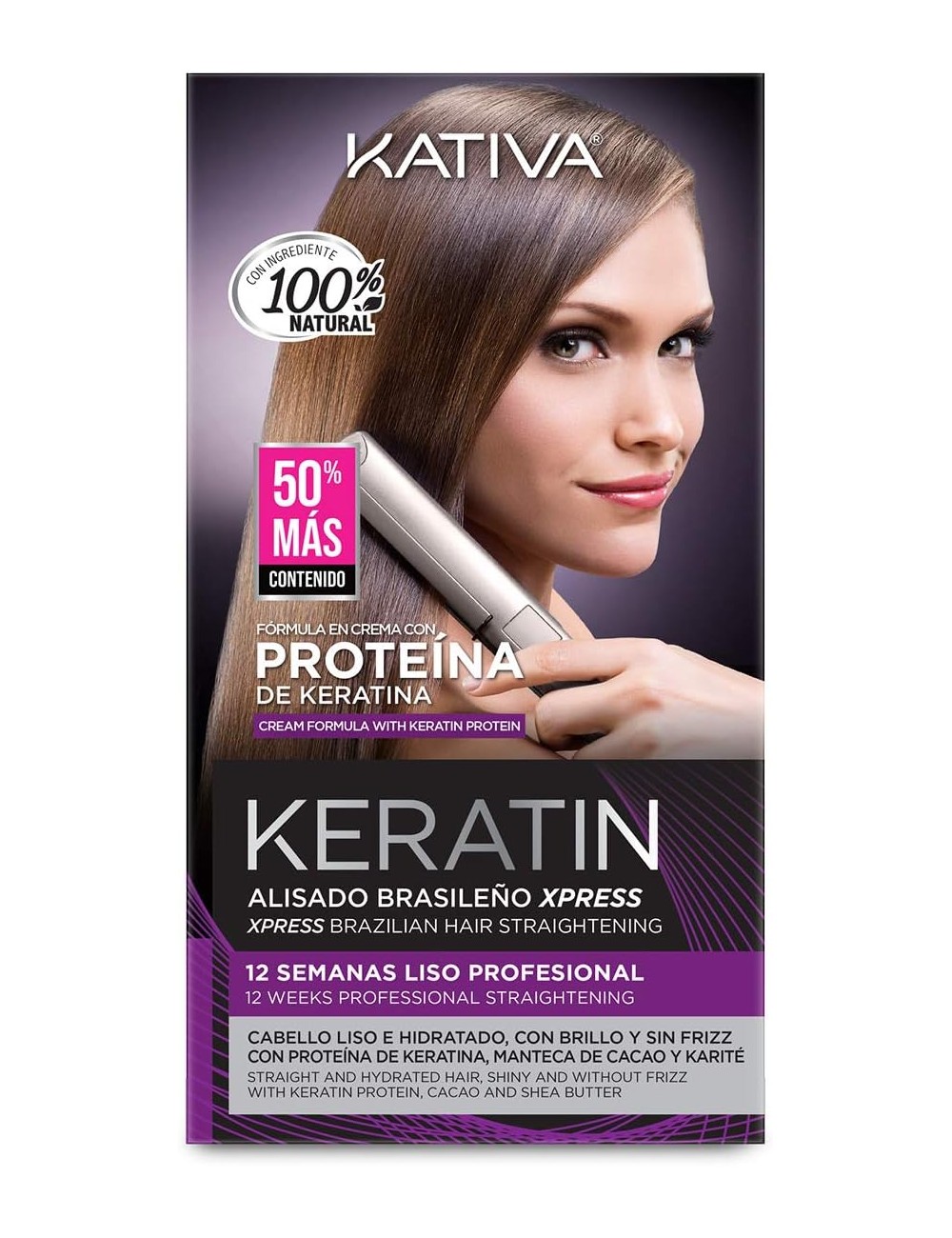 Il kit Keratin liscio brasiliano con piastra Kativa liscia i capelli ricci, voluminosi e crespi fino a 12 settimane lasciando i capelli morbidi e lucenti. Il trattamento Xpress contiene ingredienti al 100% naturali e la formulazione è arricchita con Proteine, Cheratina, Burro di Cacao e Burro di Karité.