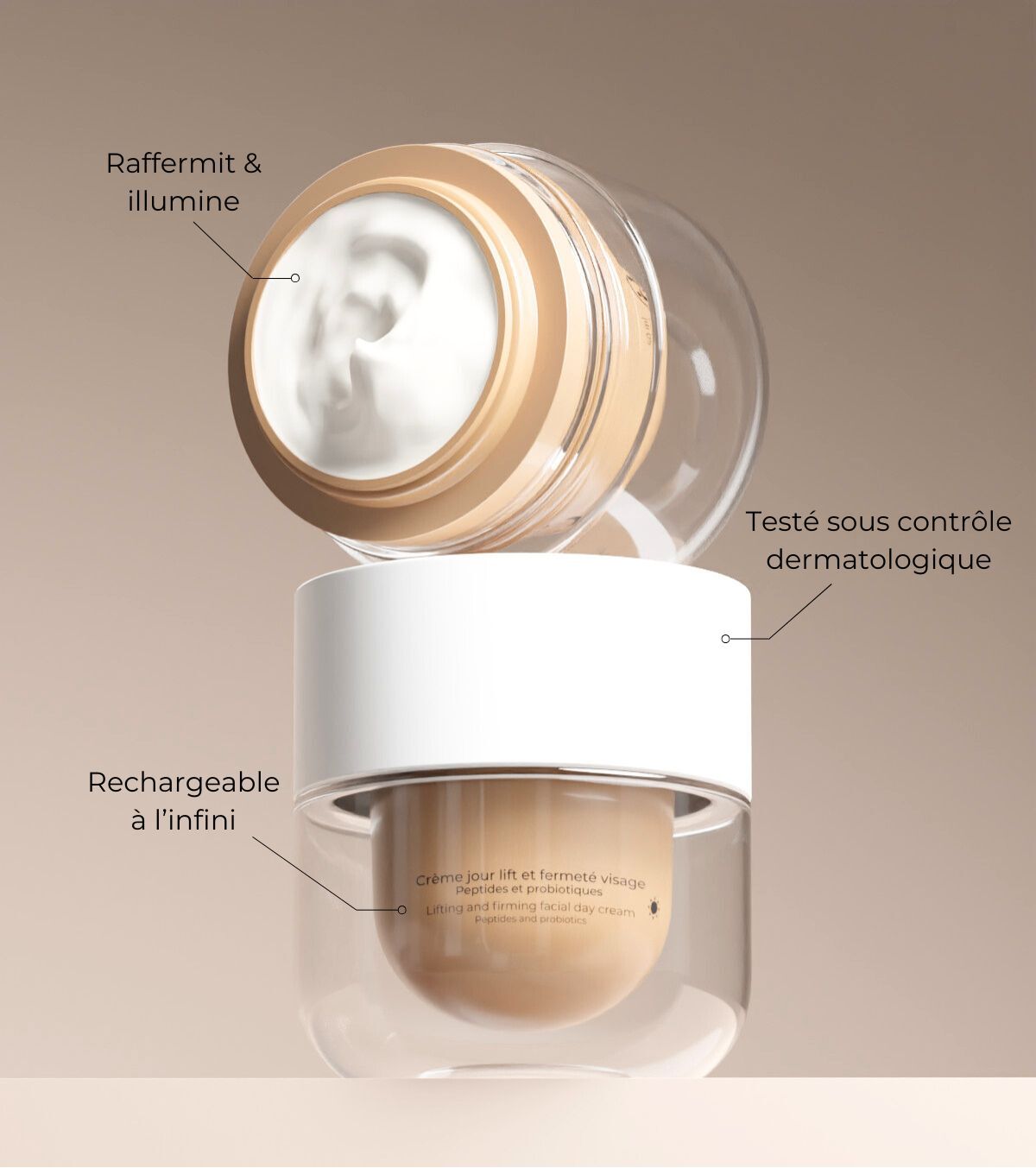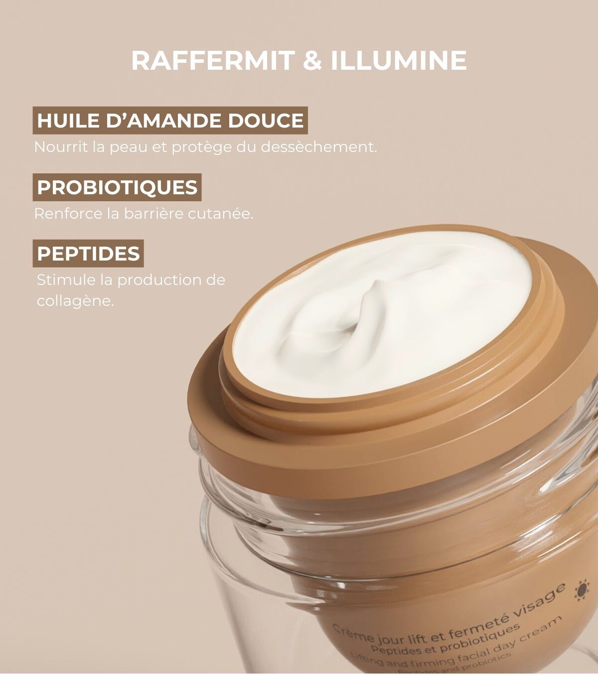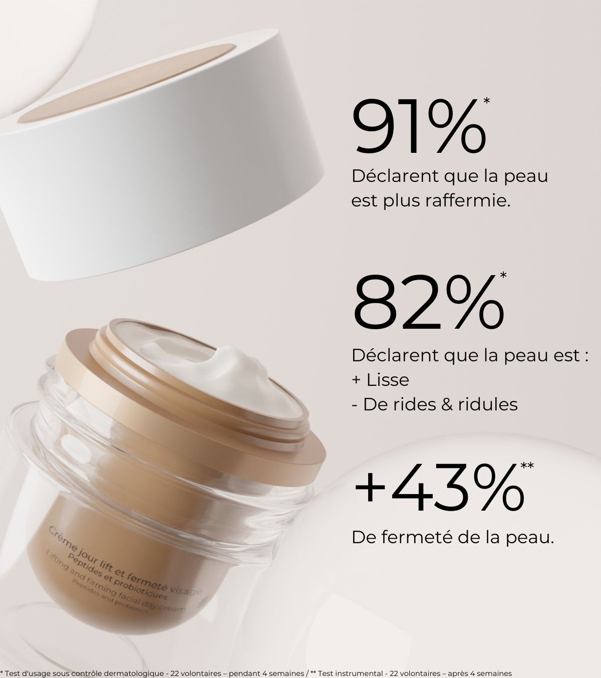 La crema giorno lifting e rassodante dalla texture cremosa rassoda la pelle, leviga e riduce rughe e linee sottili, ripristina elasticità e morbidezza, idrata, uniforma e ravviva la luminosità dell’incarnato. Formulata con peptidi, probiotici e olio di mandorle dolci, questa crema da giorno dermatologicamente testata corregge i segni dell’invecchiamento. Giorno dopo giorno, la pelle è visibilmente migliorata.