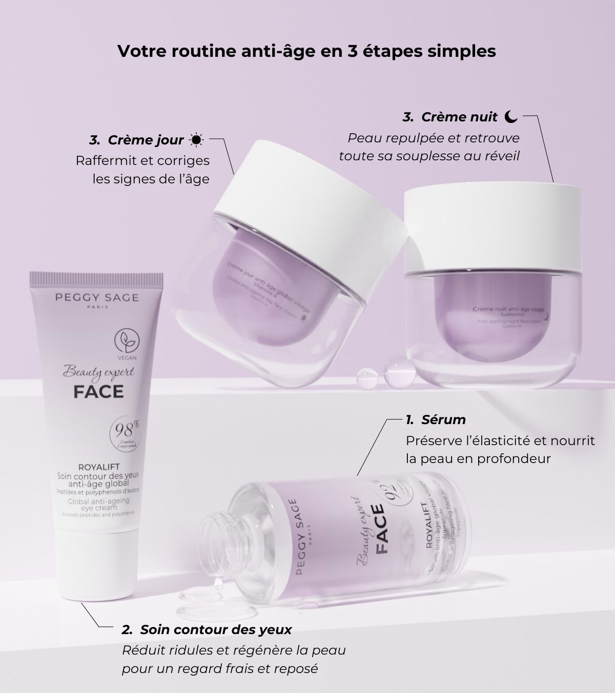 Applicare ogni sera su viso e collo perfettamente detersi. Per risultati ottimali, applicare il siero anti-età rif. 404560 sotto la crema.