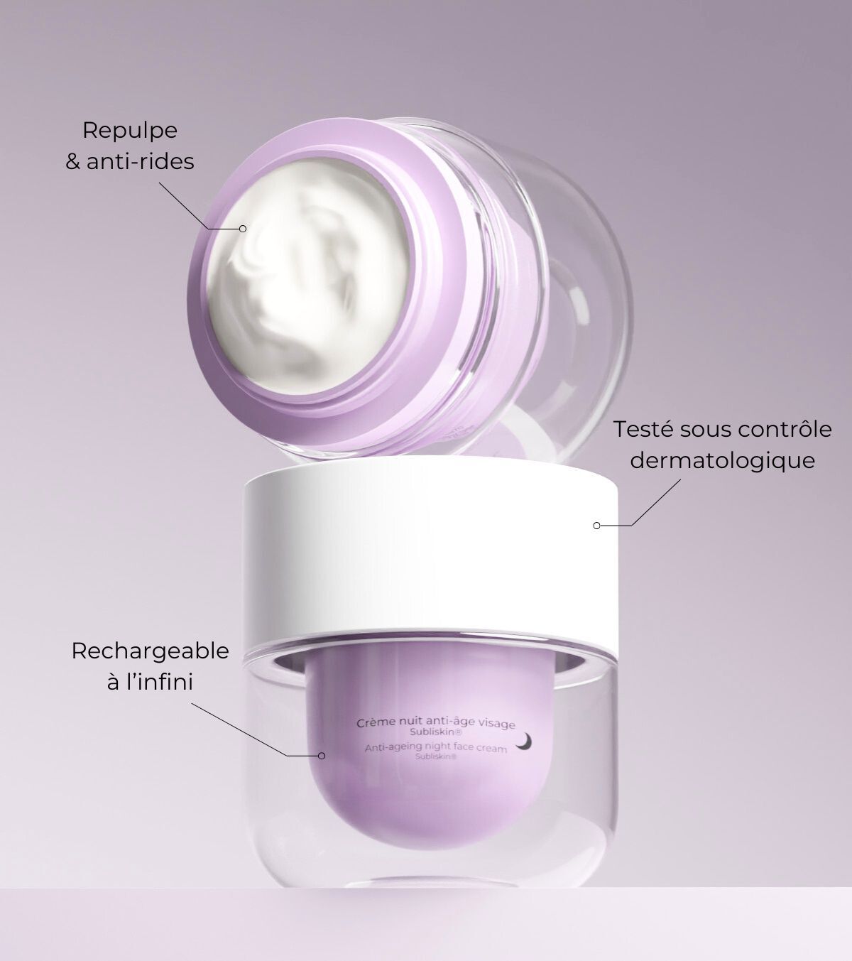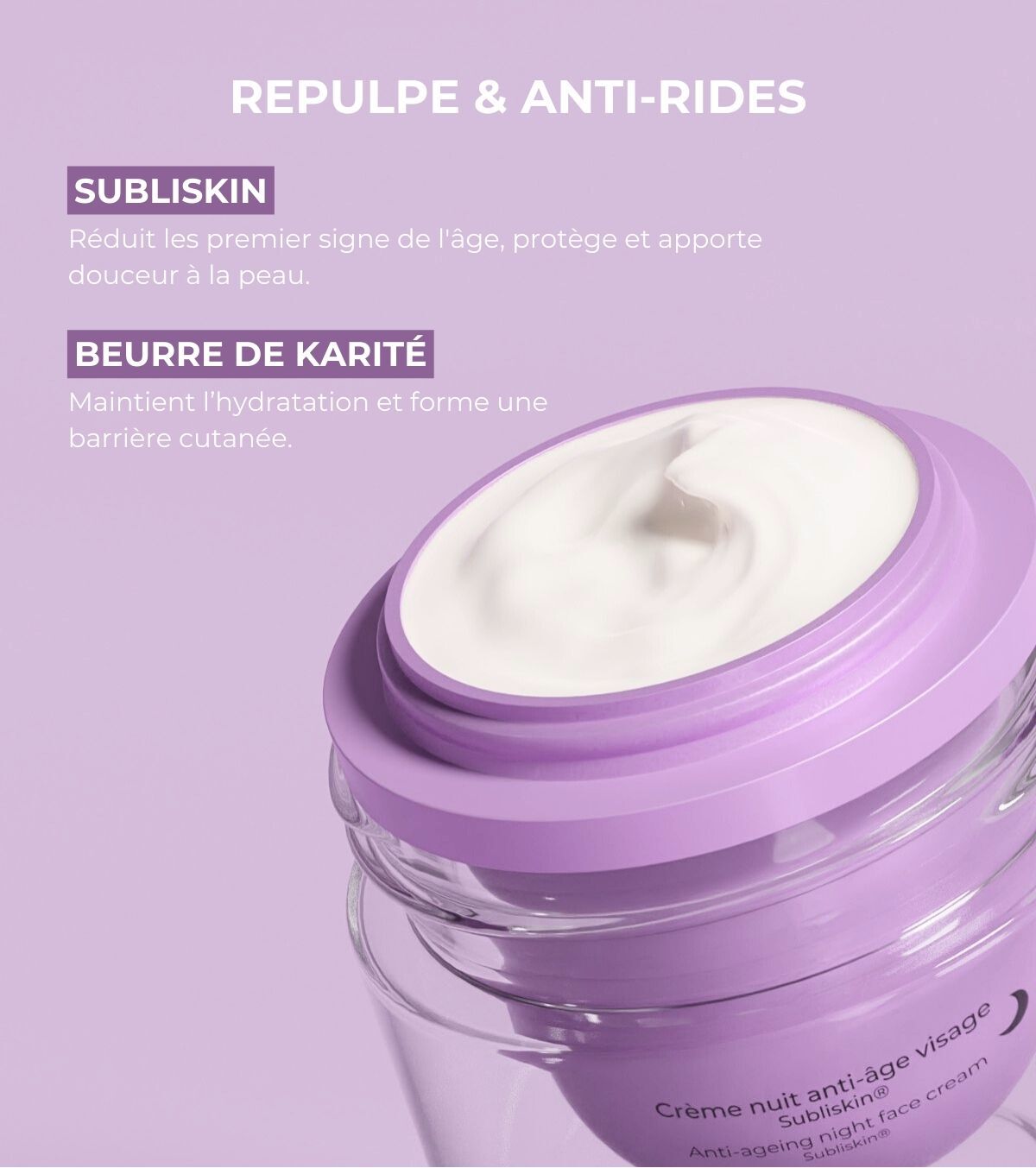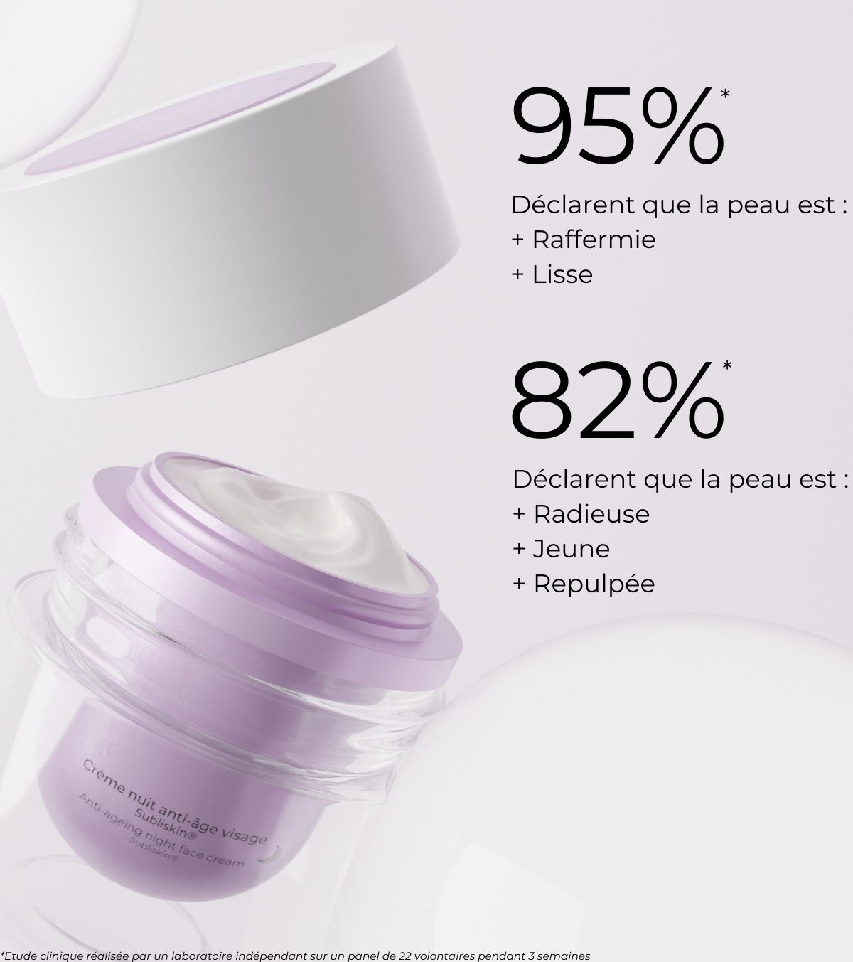 La crema da notte anti-età globale, prodotta in Francia con il 92% di ingredienti di origine naturale, dona alla tua pelle un aspetto giovane, liscio e radioso al risveglio. La sua formula innovativa, arricchita con Subliskin®, principio attivo brevettato, potenzia l’idratazione, distende i tratti e dona alla pelle un comfort ottimale. Arricchita con burro di karité, questa crema avvolge il viso con una morbidezza setosa. Notte dopo notte, i segni della stanchezza svaniscono, lasciando la pelle visibilmente levigata, rassodata e rimpolpata. Dermatologicamente testato.