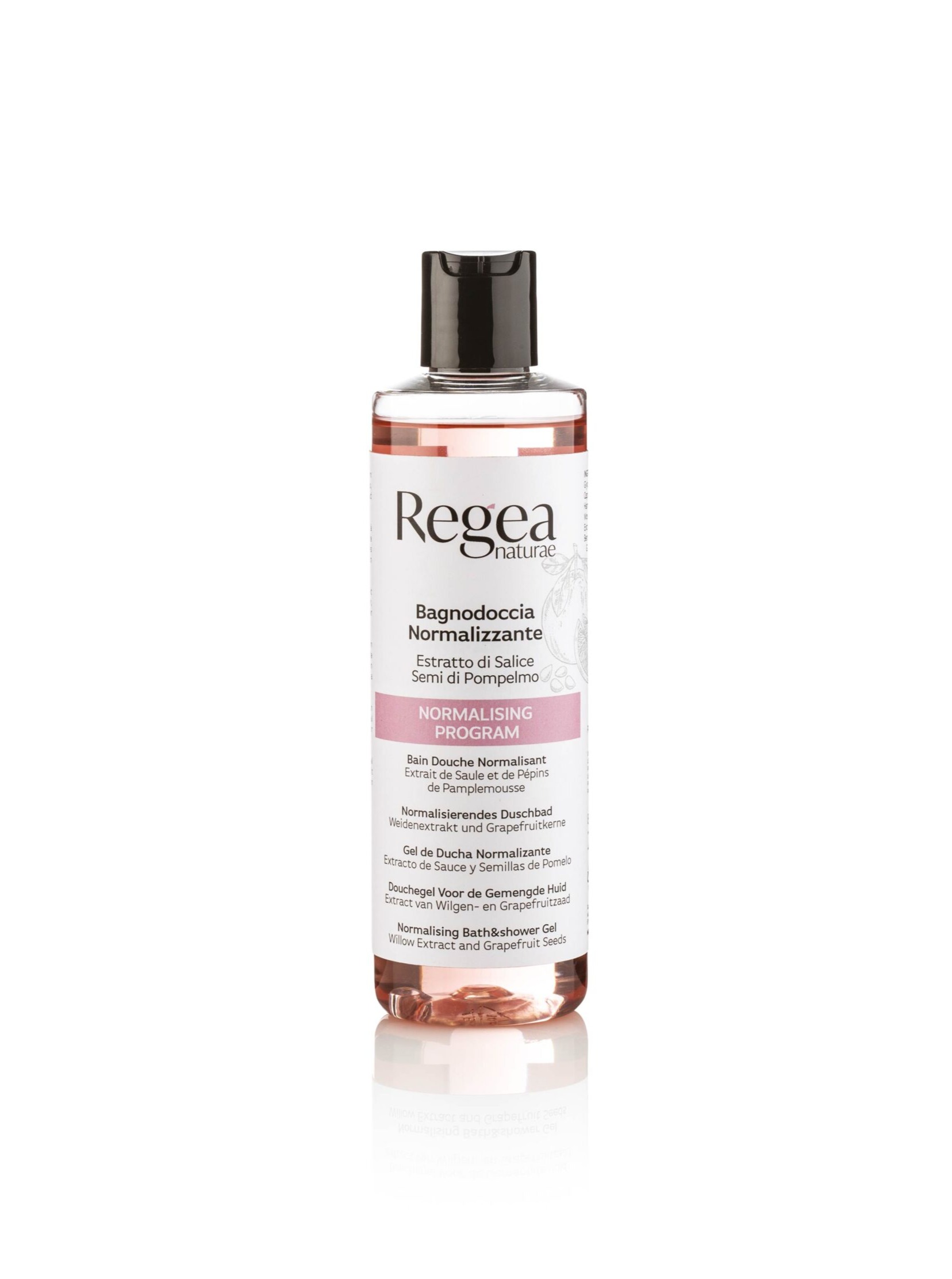 Il Bagno schiuma normalizzante con estratto di salice e semi di pompelmo fa parte della linea NORMALIZING PROGRAM Regea.
