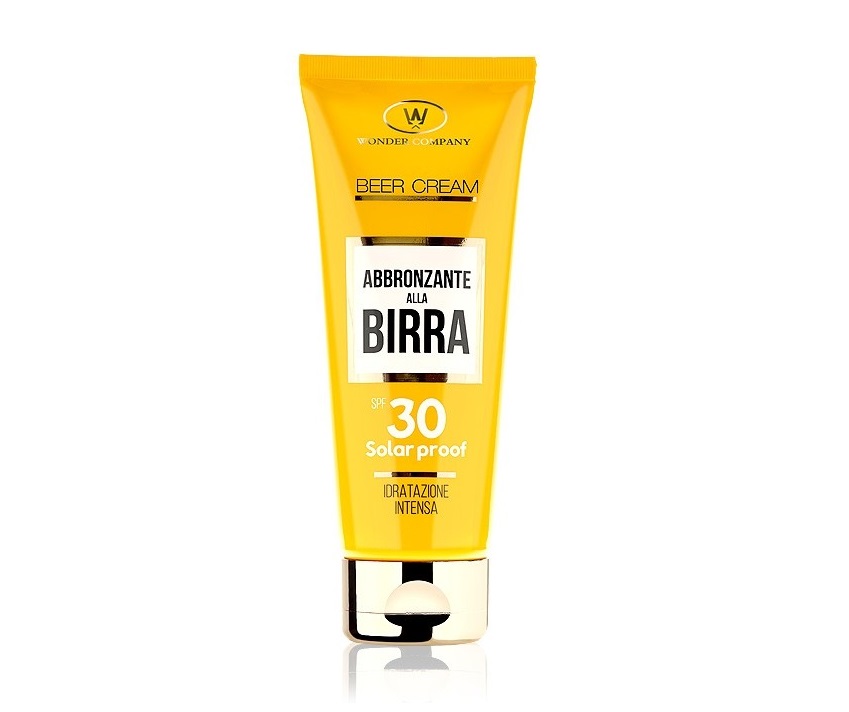 Beer Cream, la crema solare alla birra protezione 30, un doppio effetto protettivo e stimolante dell’abbronzatura grazie alla presenza di filtri solari UVA/UVB a media protezione, alga dorata e birra.